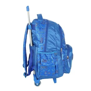 Mochila de rodinhas com alça, bolsos laterias em tela com elástico, alças de costas espumadas e reguláveis, silk frontal, bolso frontal com zíper, alça de mão e etiquetas personalizadas.