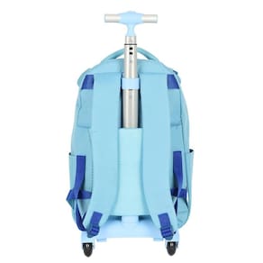 Mochila de rodinhas com alça, bolsos laterias em tela com elástico, alças de costas espumadas e reguláveis, silk frontal, bolso frontal com zíper, alça de mão e etiquetas personalizadas.