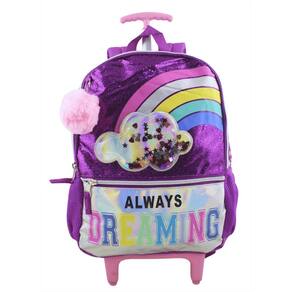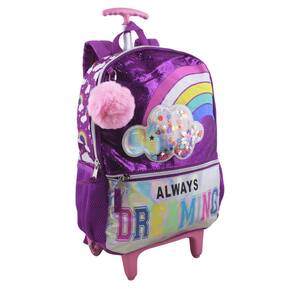 DESCRIÇÃO DA MOCHILA: - Disponível nas cores; Preta e Roxa - Estampa de Arco Íris, confete metalizado e glitter. - Chaveiro de pompom. - Rodinhas de silicone. - Alça nas costas com regulagem de tamanho. - Alça superior para segurar na mão quando necessário. - Bolsos laterais. - Possui 2 bolsos, sendo um principal e o outro um pouco menor.