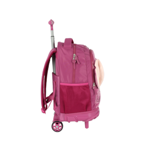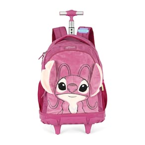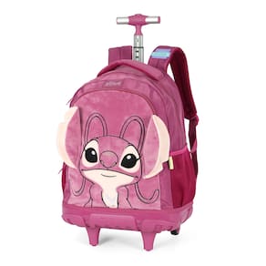 Marca: Luxcel (Licenciada Oficialmente Disney/Lilo & Stitch). Personagem/Tema: Angel. Modelo: Mochila de Rodinhas (Carrinho). Design de Destaque: Rosto da Angel em pelúcia aveludada e orelhas em 3D. Cor Principal: Roxo/Pink. Funcionalidade: Haste retrátil de alumínio e rodinhas. Organização: Compartimento principal amplo, compartimento frontal e bolsos laterais em rede (mesh).