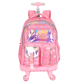 Marca: Luxcel (Licenciado Oficialmente Barbie/Mattel) Personagem: Barbie Cor Predominante: PINK (Rosa) Vibrante. Detalhes Holográficos: Bolsos frontais e detalhes em material holográfico/iridescente que brilha e muda de cor. Estampa: Logos da Barbie em relevo ou padrão em toda a mochila. Sistema de Rodinhas: Carrinho embutido e retrátil com haste de metal. Rodas: Rodinhas de silicone/gel resistentes na cor rosa translúcido. Tamanho (G): Amplo espaço interno, ideal para cadernos grandes e materiais escolares. Compartimento principal com zíper. Bolsos frontais diversos (um com aba e fita de ajuste, e outro com tela/rede, ambos com zíper). Bolsos laterais em rede (mesh) para garrafas. Conforto: Possui alças de costas acolchoadas (para usar quando necessário) e alça de mão. Detalhes: Puxadores de zíper personalizados.