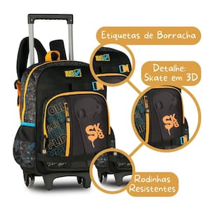 A Mochila de Rodinhas Infantil Masculina Skate SK25046K é a escolha ideal para meninos cheios de energia que querem unir praticidade, resistência e estilo no dia a dia escolar. Confeccionada em poliéster de alta qualidade, apresenta frente em telado duplo, etiqueta emborrachada e puxadores de zíper personalizados que garantem um visual exclusivo. O compartimento principal é espaçoso e acomoda com facilidade livros, cadernos e materiais escolares, enquanto os dois bolsos frontais com fechamento em zíper, sendo um deles com recorte em EVA que cria um efeito 3D incrível, oferecem organização extra. Nas laterais, bolsos telados facilitam o acesso a garrafinhas ou acessórios. A estampa moderna inspirada no universo do skate, com nomes de manobras e símbolos da modalidade, transmite atitude e autenticidade. Versátil e confortável, pode ser Utilizado como carrinho, com puxador em alumínio, rodinhas resistentes e base de apoio frontal, ou nas costas, com alças ajustáveis, acolchoadas e alça de mão superior. Com dimensões aproximadas de 40x30x13cm, é perfeita para acompanhar os pequenos skatistas em cada aventura escolar com praticidade, segurança e muito estilo. Marca: Não Informado