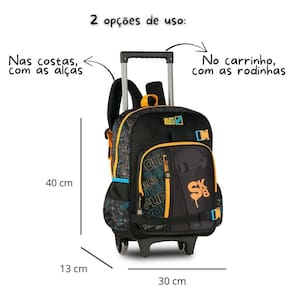 A Mochila de Rodinhas Infantil Masculina Skate SK25046K é a escolha ideal para meninos cheios de energia que querem unir praticidade, resistência e estilo no dia a dia escolar. Confeccionada em poliéster de alta qualidade, apresenta frente em telado duplo, etiqueta emborrachada e puxadores de zíper personalizados que garantem um visual exclusivo. O compartimento principal é espaçoso e acomoda com facilidade livros, cadernos e materiais escolares, enquanto os dois bolsos frontais com fechamento em zíper, sendo um deles com recorte em EVA que cria um efeito 3D incrível, oferecem organização extra. Nas laterais, bolsos telados facilitam o acesso a garrafinhas ou acessórios. A estampa moderna inspirada no universo do skate, com nomes de manobras e símbolos da modalidade, transmite atitude e autenticidade. Versátil e confortável, pode ser Utilizado como carrinho, com puxador em alumínio, rodinhas resistentes e base de apoio frontal, ou nas costas, com alças ajustáveis, acolchoadas e alça de mão superior. Com dimensões aproximadas de 40x30x13cm, é perfeita para acompanhar os pequenos skatistas em cada aventura escolar com praticidade, segurança e muito estilo. Marca: Não Informado