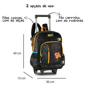 A Mochila de Rodinhas Infantil Masculina Skate SK25046K é a escolha ideal para meninos cheios de energia que querem unir praticidade, resistência e estilo no dia a dia escolar. Confeccionada em poliéster de alta qualidade, apresenta frente em telado duplo, etiqueta emborrachada e puxadores de zíper personalizados que garantem um visual exclusivo. O compartimento principal é espaçoso e acomoda com facilidade livros, cadernos e materiais escolares, enquanto os dois bolsos frontais com fechamento em zíper, sendo um deles com recorte em EVA que cria um efeito 3D incrível, oferecem organização extra. Nas laterais, bolsos telados facilitam o acesso a garrafinhas ou acessórios. A estampa moderna inspirada no universo do skate, com nomes de manobras e símbolos da modalidade, transmite atitude e autenticidade. Versátil e confortável, pode ser Utilizado como carrinho, com puxador em alumínio, rodinhas resistentes e base de apoio frontal, ou nas costas, com alças ajustáveis, acolchoadas e alça de mão superior. Com dimensões aproximadas de 40x30x13cm, é perfeita para acompanhar os pequenos skatistas em cada aventura escolar com praticidade, segurança e muito estilo. Marca: Não Informado