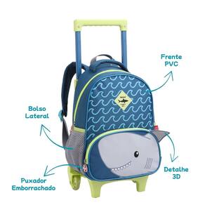 Características Mochila: - Estampa divertida e colorida de tubarão - Rodinhas resistente em gel - Alça De Mão - Alças acolchoadas para usar como mochila nas costas - Compartimento principal espaçoso + bolso frontal - Bolsos laterais para garrafinha ou acessórios - Material leve, durável e fácil de limpar - Detalhe 3D