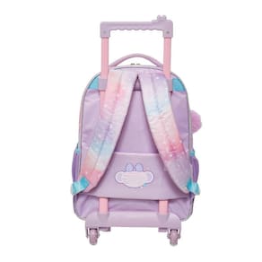 Mochila de rodinhas Lilica Ripilica com alças de costas, que conta com estampa frontal, bolso frontal, telinha lateral, compartimento grande com fechamento em zíper e etiquetas personalizadas.
