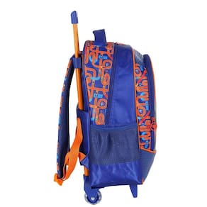Mochila de rodinhas com alça, bolsos laterias em tela com elástico, alças de costas espumadas e reguláveis, silk frontal, bolso frontal com zíper, alça de mão e etiquetas personalizadas.