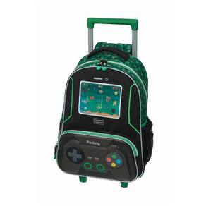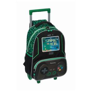 Mochila de rodinhas Pacific com alças de costas, que conta com estampa frontal, bolso frontal, telinha lateral, compartimento grande com fechamento em zíper e etiquetas personalizadas.