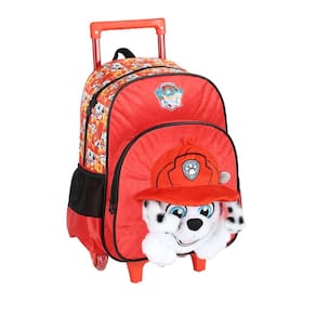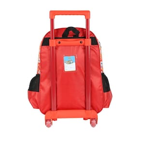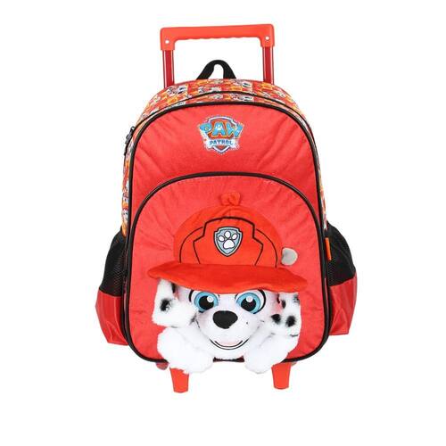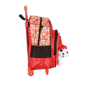 Mochila de rodinhas sem alça, bolsos laterias em tela com elástico, pelúcia em 3D frontal, bolso frontal com zíper, alça de mão e etiquetas personalizadas.