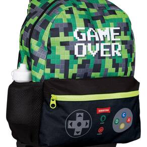 Hora do game over das mochilas de rodinha sem graça! Com o carrinho, as duas rodinhas e pés de apoio, o peso do seu material escolar vai para o chão. Antes de dar play, confere tudo o que esse modelo possui: bolso frontal com desenho que parece um controle de videogame, bolsos laterais com tecido de redinha, alça de mão e um compartimento central amplo, que cabe a pasta de atividades e o restante do material. E aí, bora dar um upgrade nesse estilo.