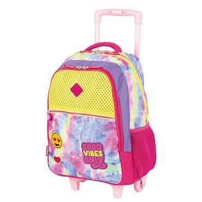 Sinta toda a vibe de ser uma blogueirinha no dia a dia e na sala de aula com a linha Good Vibes da Sestini! Essa mochila grande com rodinhas oferece um amplo espaço interno para organização dos pertences e bolso frontal de fácil acesso aos objetos com puxador personalizado. Também é confeccionada em material resistente e de fácil limpeza. É possível transportar sua garrafinha com facilidade, utilizando os bolsos laterais. Possui tag de identificação e alças e costas espumadas para o conforto diário.