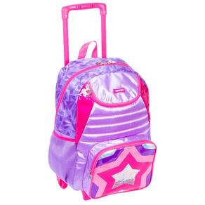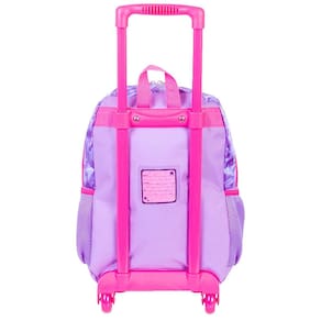 Os tons de lilás e rosa se destacam nesta coleção que vai brilhar! No bolso frontal, várias estrelas e um painel com confetes coloridos contrastam com o matelassê do outro bolso, menor. Na estampa em cetim, uma profusão de estrelas combina com o material com glitter e o puxador personalizado. A versão com carrinho tem duas rodinhas e pés de apoio, para facilitar o deslocamento e tirar o peso da sua estrela das costas!