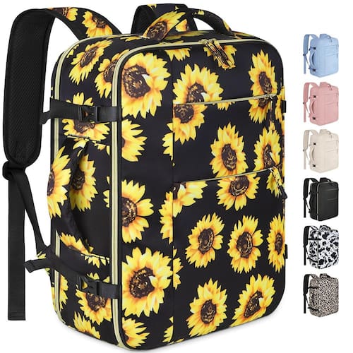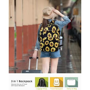 Capolo Mochila de viagem para mulheres e homens, impermeável, para laptop, aprovada por companhias aéreas, bolsa de mão para computador, negócios, viagens, serve para laptop de 17 polegadas (girassol) - Mochila de transporte confortável: com um painel traseiro de malha respirável e alças acolchoadas projetadas para aliviar efetivamente a pressão em seus ombros e pescoço. 34 x 19 x 47 cm em conformidade com a maioria dos regulamentos das companhias aéreas para malas de mão, garantindo viagens sem complicações - 11 bolsos para armazenamento e organização: vasculhar seu item em uma mochila bagunçada pode ser enlouquecedor. Mais bolsos para melhor armazenamento, ajudando você a encontrar o que deseja mais rápido. Fecho de zíper de 180°. Compartimentos principais espaçosos com espaço para todas as suas coisas, incluindo 1 bolso de malha e 1 bolsa úmida para manter seu item limpo e organizado. 2 bolsas frontais com zíper podem ser usadas para guardar chaves e cartões. 1 compartimento para laptop com bolso organizador pode ser utilizado para guardar cadernos, canetas, fones de ouvido e outros itens pequenos - Mochila 3 em 1 com capacidade de 20L: a alça lateral ajuda você a fazer a transição perfeita de uma mochila para uma bolsa de mão, oferecendo flexibilidade para qualquer cenário de viagem. O modo mochila garante conforto e liberta suas mãos durante as explorações, enquanto a alça de bagagem permite que você a prenda sem esforço à sua mala, adicionando uma camada extra de conveniência. Melhore sua experiência de viagem com uma bolsa que se adapta às suas necessidades, oferecendo estilo, funcionalidade e a solução perfeita de viagem tudo em um só - 4 fivelas laterais ajustáveis de compressão e zíper duplo: utilize 4 fivelas laterais ajustáveis para proteger firmemente seus pertences, reduzir deslocamentos e eliminar suas preocupações com aberturas indesejadas. As alças laterais adaptáveis mantêm o perfil elegante da bolsa. Abrace a conveniência de um zíper duplo e um design de fecho de 180° para acesso sem esforço. Invista em um companheiro de viagem que antecipa suas necessidades, proporcionando conforto e um toque de sofisticação às suas aventuras - Materiais resistentes à água: nossas mochilas são feitas de poliéster resistente à água de nova geração para proteger seus itens de gotas de chuva, suor e umidade