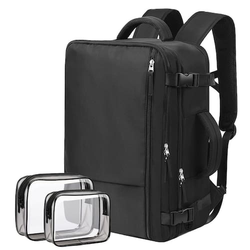 Hanples Mochila de viagem, uma mochila de marca de alta qualidade, foca no design e desenvolvimento de pessoas para viajar. Temos a missão de dar prioridade à experiência do usuário das pessoas, explorando e buscando um estilo de vida moderno, de alta eficiência e único. À prova de A mochila para laptop tem boas almofadas grossas no compartimento do laptop e no compartimento principal para proteger o laptop e outros itens dentro da mochila. É adequada para laptop de 15,6 polegadas. Maior capacidade A capacidade da mochila é de 35 L, você pode levá-la para viagens de 3 a 5 dias. À prova d'água. A mochila geral para viagens é feita de tecido à prova d'água para evitar que você se molhe em dias chuvosos, e também há um compartimento de separação seco e molhado dentro, o que é conveniente para você guardar roupas de reposição molhadas. Alça grossa e larga As alças de ombro da mochila de viagem podem ser escondidas e as alças superiores e laterais grossas e largas podem ser usadas como bolsa de mão e também há uma alça de bagagem para ajudá-lo a fixá-la na mala. Esponja respirável A parte de trás da mochila casual é feita de esponja elástica e respirável. É respirável e pode tirar o calor sem superaquecer suas costas. Este item não se destina a ser utilizado por crianças menores de 12 anos. - Conjunto de mochila de viagem multifuncional: contém uma mochila de viagem + 2 bolsas de higiene pessoal transparentes, perfeitas para universidade, biblioteca, academia, trabalho, viagens de negócios, viagens, fins de semana. Também pode ser usada como mochila escolar e de negócios, esta mochila antirroubo é uma ótima escolha para estudantes, professores, enfermeiros, homens e mulheres! - Essenciais de viagem de avião: projetada exclusivamente para viagens de avião, esta mochila de bagagem de mão pode ser aberta de 90 a 180 graus facilmente e rapidamente na segurança do aeroporto. Projetada para caber no tamanho máximo permitido em um voo, está disponível para manter sob o assento em voo como item pessoal, para companhias aéreas como Spirit, Easy Jet, Jet Blue. - Tamanho: 29 x 19,8 x 42 cm, capacidade 35 L. Com 4 compartimentos grandes e 6 bolsos, cabe em um laptop de 17 polegadas, é uma boa companhia para uma viagem de 3 a 5 dias. Tamanho das bolsas de higiene pessoais: 20 x 15 x 6 cm, tamanho das bolsas de higiene pequenas: 17 x 12 x 6 cm. - Impermeável e durável: esta mochila de viagem leve é feita de material de poliéster impermeável durável, resistente e suave, com alças de ombro e seções traseiras ergonomicamente projetadas para tornar sua viagem confortável e agradável! O bolso traseiro oculto mantém seus pertences protegidos contra roubo. - Porta aberta multifuncional para carregar e ouvir: a porta versátil do lado da mochila de viagem pode fornecer acesso conveniente para carregar seu telefone ou você pode usá-lo como uma porta de fone de ouvido para ouvir sua música premium. (Dicas: apenas uma porta aberta, cabo de carregamento e carregador portátil não estão incluídos)