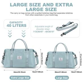 Weekender Overnight Bag for Women - Design separado a seco e molhado: o bolso de material resistente à água de alta densidade pode ajudá-lo a separar itens secos e molhados, se você tiver roupas ou toalhas molhadas, pode colocá-la nesta bolsa de ginástica. Não se preocupe com eles ficarem molhados - Bolsa noturna de tamanho extra grande: o tamanho extra maior aumenta a capacidade em 30%, seu tamanho é 40 L; Dimensões: 34 x 64 x 18 cm. Atende à maioria dos requisitos internacionais de bagagem de mão. Esta bolsa de viagem de fim de semana tem 6 bolsos - Bolsa de viagem adequada para aviões: a bolsa de mão perfeita para viagens aéreas. A manga de carrinho integrada desliza sobre a alça de bagagem, facilitando as viagens no aeroporto. Sua bolsa de embarque ideal para o fim de semana para viagens de negócios ou pessoais - Bolsa esportiva de ampla aplicação: uma escolha perfeita para você carregar todos os seus esportes, academia, viagens de fim de semana, uso diário e itens essenciais de viagem. Use como bolsa de viagem, bolsa de fim de semana, bolsa de mão, bolsa de itens pessoais, bolsa de ginástica - Bolsa de fim de semana com pontos extras: as bolsas de viagem femininas vêm com uma alça ajustável removível, você pode carregá-la como bolsa de ombro, bolsa de mão ou bolsa cruzada como quiser. As bolsas femininas de fim de semana são feitas de tecido de nylon resistente a rasgos e à água de alta qualidade