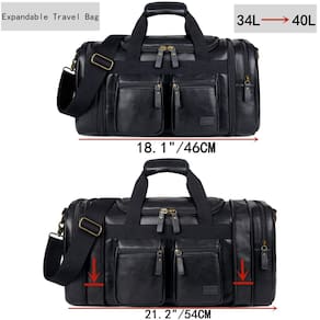 Bolsa esportiva esportiva de couro vegano para viagem de fim de semana HB-21, Preto, Bolsa de viagem de couro - Material: Couro sintético macio e forro de cor vermelha - 99% como couro verdadeiro e não machuca animais - Design expansível: 21,2 x 10,2 x 11 polegadas/54 x 26 x 28 cm (CxLxA); Alça de ombro: 70,1 cm - 133,1 cm - Manga de bagagem: a manga traseira permite que você a deslize sobre a mala/bagagem/alça de bolsa de rodinhas - Grande capacidade: esta bolsa pode caber em 3-4 dias de itens essenciais do dia a dia, como roupas, sapatos, copos, laptop de 15 polegadas, iPad Air e outros dispositivos eletrônicos. - Continue: nossa bolsa é projetada para atender aos regulamentos de voo e requisitos para bagagem de mão.