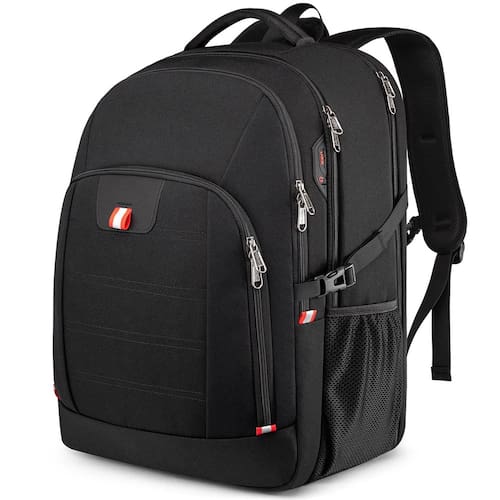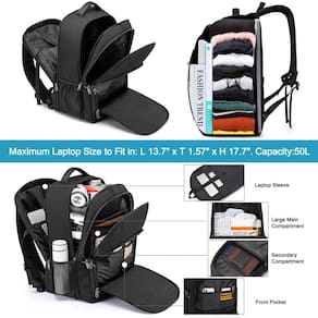 Mochila de grande capacidade com compartimento separado para notebooks de até 18,4 polegadas - GRANDE CAPACIDADE E ESPAÇO DE ARMAZENAMENTO: Tamanho da mochila grande: 35,8 cm * 24,9 cm * 54,9 cm. Capacidade: 50 L. Um compartimento separado para laptop comporta laptops de 18,4 polegadas, bem como laptops de 17,3, 17, 16, 15,6 e 15 polegadas. Um compartimento principal Rommy para roupas, acessórios de viagem de trabalho e arquivos serve para viagens de negócios curtas. Compartimento secundário espaçoso para necessidades diárias ou suprimentos. Organizador frontal para pequenos itens, canetas, chaves, óculos. Bolsos laterais profundos com zíper para guarda-chuva ou garrafa de água - Aprovada pela TSA e resistente: Design conveniente no ponto de verificação: a mochila de negócios pode ser aberta de 90 a 180 graus, fazendo você passar rapidamente pela segurança do aeroporto e manter os itens organizados, projetada exclusivamente para viagens de avião. A alça de bagagem permite que a mochila se encaixe na bagagem/mala, deslize sobre o tubo da alça vertical para facilitar o transporte. Com um bolso oculto antirroubo na parte de trás protege seus itens valiosos de ladrões - Orifícios funcionais para USB e fone de ouvido: com fenda de carregamento USB, a mochila USB grande oferece a você uma maneira mais conveniente de carregar seu telefone enquanto caminha. Um orifício para fone de ouvido externo dá fácil acesso ao uso do fone de ouvido. Permite que você ouça música e aproveite a viagem com as mãos livres. Observe que esta mochila não inclui o carregador portátil em si, o orifício de carregamento USB oferece apenas uma maneira fácil de carregar. A mochila preta para computador é adequada para atividades internas e externas - Material resistente e sólido: esta mochila estética é feita de tecido de poliéster resistente à água e resistente com zíper de metal macio. Garante um uso seguro e duradouro no dia a dia e em viagens. Serve como bolsa de viagem, mochila de professor, mochila de trabalho, mochila de caminhada - ADEQUADA PARA TODAS AS PESSOAS/OCASIÕES: a mochila antirroubo é perfeita para o trabalho/deslocamento/viagens internacionais/viagem de fim de semana/caminhada/acampamento. Ótimo presente para mulheres / homens / família / amigos / mãe / pai. É uma boa escolha para adultos como mochila de trabalho, escritório, viagem de negócios, mochila de viagem ou mochila de compras diárias