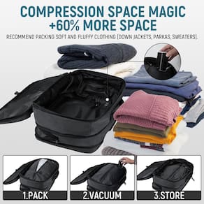Dinictis Mochila Airback com bomba, expansível até 60 L com compressão a vácuo, mochila Vacpack para viagens, Cinza escuro, Mochilas de viagem - Compressão a vácuo: Design de válvula de saída unidirecional, não é fácil de expandir após a compressão. Você pode pressionar manualmente ou combinar com a bomba para comprimir rapidamente o volume do compartimento e melhorar a utilização do espaço da bagagem. Extremamente adequada para embalar roupas fofas (jaquetas, parkas, casacos, suéteres). Para garantir o efeito de compressão, o zíper hermético é utilizado, o que é mais difícil de abrir e requer força. - Mochila de mão expansível: a mochila airback oferece espaço extra quando necessário e, quando totalmente expandida, tem a capacidade de uma mala de 61 cm. Oferece muito espaço para todos os seus itens essenciais e atende aos regulamentos das companhias aéreas para itens pessoais, além de sua praticidade - Mestre organizador: a mochila de viagem é cuidadosamente colocada com compartimentos e bolsos para organizar efetivamente seus pertences. O compartimento principal tem um bolso molhado para itens úmidos separados, um compartimento separado para um laptop de até 17 polegadas e um bolso traseiro de privacidade para manter seus pertences identificados durante a viagem. O compartimento principal espaçoso comporta facilmente de 10 a 20 roupas, o que o torna perfeito para viagens curtas e longas. - Confortável e ergonômica: a mochila a vácuo é acolchoada com esponja de colmeia nas costas, ergonômica, respirável e dissipação de calor; combinada com alças elásticas largas e flexíveis para deixar toda a parte de trás dos ombros uniformemente estressada, muito tempo para se manter confortável. Alças de carrinho para prender a mochila ao estojo. - Garantia de qualidade: a mochila é feita de tecido resistente à abrasão e resistente à água, que apresenta excelente durabilidade e praticidade para todos os tipos de clima. É útil para aqueles que gostam de levar coisas leves, mas precisam de mais espaço de armazenamento para viagens longas, tornando-a a primeira escolha para viajantes que precisam otimizar seu espaço de bagagem.