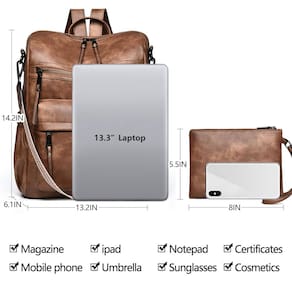 Dora & Liz Mochila feminina de couro para viagem, moda, mochila de grife, bolsas de ombro femininas, Camelo - Material atualizado – de acordo com sugestões de produtos mencionadas por alguns clientes, tentamos o nosso melhor para melhorar o conforto e a durabilidade desta bolsa. Portanto, selecionamos couro de alta qualidade com costura reforçada, acessórios de hardware mais grossos, zíperes mais suaves e forro de tecido de poliéster durável. Observações: diferentes lotes de couro existem diferenças de cor, certifique-se de aceitá-la antes de comprar. - Super bolso múltiplo e zíper em forma de U – 1 compartimento principal inclui 2 bolsos com zíper e 3 bolsos com compartimento, 2 bolsos frontais externos com zíper, 2 bolsos laterais externos e 1 bolso externo com zíper traseiro, que mantém suas coisas bem organizadas. Vale ressaltar que os zíperes em forma de U do compartimento principal são projetados para abrir em duas direções para ter um acesso rápido aos seus itens, deve ser conveniente para você. - Várias formas de transporte: esta mochila grande tem um design moderno e muito prática. A alça de ombro removível faz com que possa ser transportada de diferentes maneiras para uma mochila ou uma bolsa de ombro único. Também é uma opção ideal para uso ao ar livre, como acampamento, compras, viagens, encontros, trabalho, etc. - Grande capacidade – 33,5 cm (C) x 15,5 cm (L) x 36 cm (A), Peso: 0,9 kg; Pulseira: 11,4 cm x 20,3 cm; Alça destacável: 32 cm. O espaço espaçoso pode conter seu MacBook Pro de 13,3 polegadas, iPad, arquivos A4, pastas, livros, guarda-chuva, garrafa de água, cosméticos e outros itens do dia a dia. Também é um presente perfeito para o Natal, Dia dos Namorados, aniversário e aniversário. - Garantia pós-venda – A satisfação do cliente é a primeira prioridade da Dora & Liz! Prometemos oferecer o melhor atendimento ao cliente e produtos de qualidade para todos os clientes. Não hesite em entrar em contato conosco por e-mail se você não estiver satisfeito com nossos produtos ou receber itens danificados, etc. Nós providenciaremos uma equipe de pós-venda para lidar com isso em 24 horas.