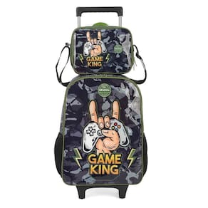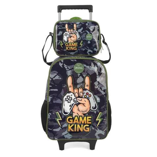 Linda mochila de rodinha infantil Up4You na cor verde com estampa de videogame super-radical!