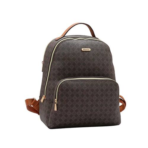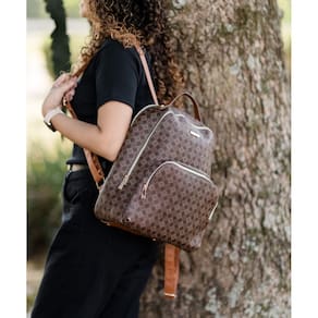 Mochila feminina com estampa exclusiva de elementos gráficos em padrão geométrico, trazendo um visual moderno e elegante para o dia a dia.