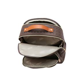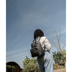 Mochila feminina com estampa exclusiva de elementos gráficos em padrão geométrico, trazendo um visual moderno e elegante para o dia a dia.