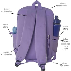 Compartimentos Organizadores: Esta mochila inclui vários compartimentos e bolsos para ajudar os estudantes a manterem seus pertences organizados. São eles: bolsos laterais para garrafinhas, bolso traseiro com ziper e bolsos frontais com zíper.