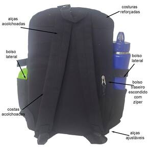 Compartimentos Organizadores: Esta mochila inclui vários compartimentos e bolsos para ajudar os estudantes a manterem seus pertences organizados. São eles: bolsos laterais para garrafinhas, bolso traseiro com ziper e bolsos frontais com zíper.