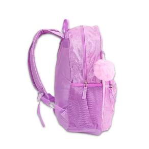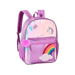 Mochila confeccionada em material poliéster. Com acabamento personalizado em glitter. Com amplo espaço interno em suas repartições. Com bolso laterais para garrafinha. Com alça acolchoada com regulagem. Com pompom decorativo. Com detalhes de arco íris em alto relevo. Com puxadores de zipe personalizado. Com alça de mão.