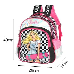 Mochila Escolar de Costas Barbie A Mochila de Costas da Barbie Luxcel é perfeita para transportar material escolar ou para uso diário. Com um design moderno e funcional, essa mochila possui amplo espaço interno, permitindo que você carregue tudo o que precisa de forma organizada e prática. Essa mochila possui um compartimento principal grande, com espaço de sobra para seus livros, cadernos e demais itens, um bolso frontal e além disso, conta com dois bolsos laterais para garrafa, ou outros objetos pequenos. Os puxadores do zíper são personalizados, adicionando um toque especial ao produto, além disso, a mochila possui uma alça de mão e alça de costas almofadadas. Fabricada em poliéster e pvc, essa mochila é resistente e durável. Características da Mochila Escolar: - 1 Bolso Principal com bastante espaço - 1 Bolso Frontal - 2 Bolsos laterais para squeeze - Estampa em alto relevo - Alças de costas acolchoadas e ajustáveis - Alça de mão reforçada na parte superior - Puxadores personalizados - Taggy identificação - Chaveiro Barbie personalizado - Material: 70% Poliéster e 30% PVC Dimensões Aproximadas: - Altura: 40 cm - Largura: 29 cm - Profundidade: 14 cm