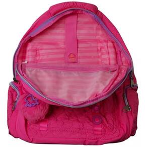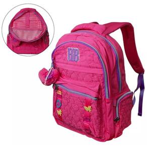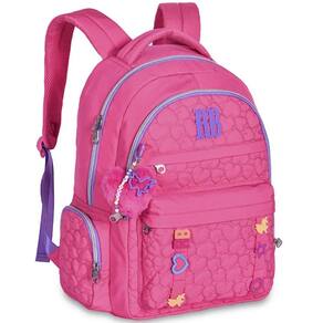 Confeccionada em material soft texturizado com matelassê personalizado, possui 1 compartimento principal com bolso para notebook, 1 bolso médio, 1 bolso pequeno telado; bolso médio com 2 bolsos internos menores para pequenos objetos e compartimento para canetas; 2 bolsos frontais,2 Bolsos laterais com zíper, bolso traseiro antifurto, Alça de mão, Chaveiro de pompom e de coração com mascote RB de plástico vazado e miçangas.