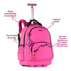 Características: - Alça de mão em cordas - Alça de costas - Chaveiro personalizado com porta fones de ouvido - Mosquetão de estrela - Placa em acrílico com QR code - Forro rosa de poá - Proteção para rodas e alças - Puxador personalizado - Compartimentos para laptop e tablet