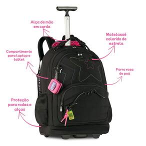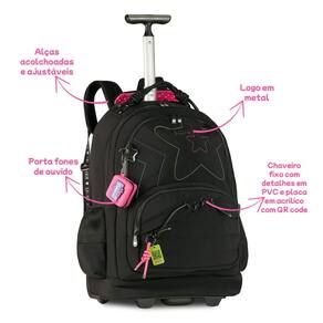 Características: - Alça de mão em cordas - Alça de costas - Chaveiro personalizado com porta fones de ouvido - Mosquetão de estrela - Placa em acrílico com QR code - Forro rosa de poá - Proteção para rodas e alças - Puxador personalizado - Compartimentos para laptop e tablet