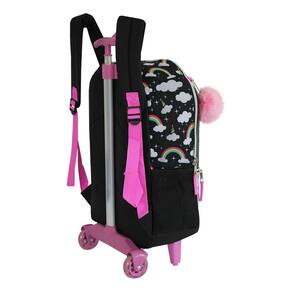 DESCRIÇÃO DA MOCHILA: - Disponível nas cores; Preta e Roxa - Estampa de Arco Íris, confete metalizado e glitter. - Chaveiro de pompom. - Rodinhas de silicone. - Alça nas costas com regulagem de tamanho. - Alça superior para segurar na mão quando necessário. - Bolsos laterais. - Possui 2 bolsos, sendo um principal e o outro um pouco menor.