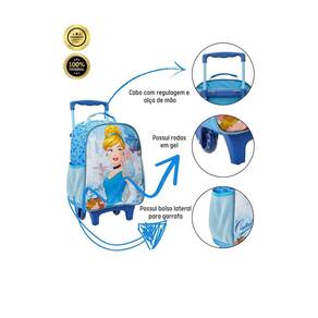 Mochila de Rodinhas da Cinderela Um sonho encantado a cada passo A mochila de rodinhas da Cinderela é mais do que apenas um acessório escolar. É um convite para um mundo de magia e encanto, onde os sonhos se tornam realidade. Com design inspirado na princesa mais amada da Disney, essa mochila é perfeita para meninas que adoram a Cinderela e buscam um item funcional e estiloso para o dia a dia. Principais características: Rodinhas: Facilitam o transporte, tornando o caminho para a escola mais leve e divertido. Bolsos laterais: Ideais para garrafinhas de água e outros pequenos objetos. Alças de mão e de puxar: Versatilidade para carregar a mochila da maneira mais confortável. Cursores personalizados: Um toque especial que encanta as pequenas princesas. Material resistente: Garante durabilidade e acompanha a criança em todas as aventuras. Qualidade: Confeccionada com materiais duráveis, a mochila acompanha a criança por muito tempo. Ideal para: Meninas fãs da Cinderela: Um presente perfeito para encantar as pequenas princesas. Dia a dia escolar: Organiza os materiais escolares e torna o caminho para a escola mais divertido. Viagens e passeios: Ideal para transportar brinquedos e lanches.
