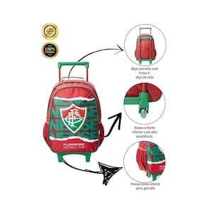 Design oficial do Fluminense: A mochila possui o brasão do clube, mostrando a paixão pelo tricolor. Rodinhas: Facilitam o transporte e ajudam a proteger as costas. Zíper resistente: Garante maior durabilidade e segurança. Bolsos laterais: Ideais para guardar garrafinhas de água ou outros objetos pequenos. Alças de mão e costas acolchoadas e ajustáveis: Conforto e versatilidade para carregar da forma que preferir. Frente com brasão: Demonstra o orgulho de ser tricolor.