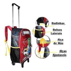 A mochila possui rodinhas, facilitando o transporte de materiais pesados. Além disso, é produzida com material resistente e confortável, garantindo alta durabilidade. Seu compartimento principal é espaçoso o suficiente para acomodar cadernos, livros e acessórios, e ainda conta com bolsos laterais para garrafinhas de água.