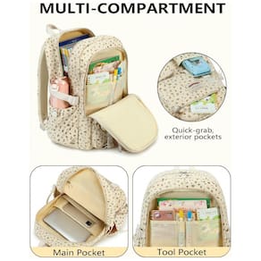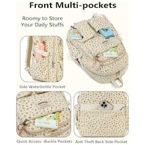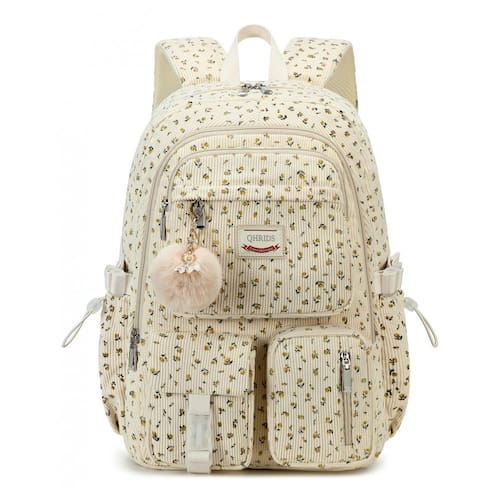 A mochila QHRIDS em veludo cotelê bege com estampa floral é uma mochila grande para alunas do ensino fundamental, médio e universitário, com compartimento para notebook e múltiplos bolsos para organização do material escolar e itens pessoais. O tecido em veludo cotelê é leve, macio ao toque e de alta densidade, com costuras reforçadas e zíperes de boa qualidade, oferecendo maior durabilidade no uso diário.