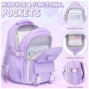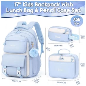 Mochila escolar Fimibuke em conjunto de 3 peças, composta por mochila, lancheira térmica e estojo, indicada para estudantes de 6 anos em diante no ensino fundamental, médio e atividades de lazer. A mochila oferece grande capacidade interna com compartimento para notebook de até 39,6 cm, divisórias para livros e cadernos, bolso intermediário para cadernos e dois bolsos frontais e laterais para itens de acesso rápido como garrafas e guarda-chuva.