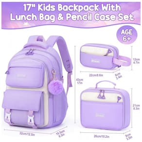O conjunto é produzido em poliéster leve, impermeável, de fácil limpeza e livre de BPA, com alças de ombro acolchoadas, ajustáveis e respiráveis, além de encosto com material respirável que auxilia na dissipação de calor e absorção do suor. A lancheira com isolamento em múltiplas camadas foi projetada para manter alimentos em temperatura adequada por várias horas, enquanto o estojo com dois compartimentos com zíper organiza lápis, canetas, marcadores e pequenos acessórios escolares, complementado por pingente em pelúcia macia no padrão roxo com bege.