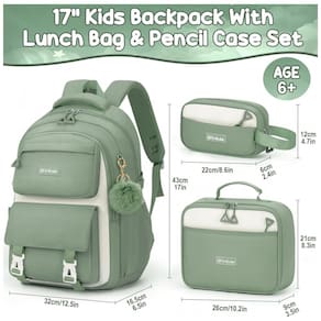 Mochila escolar Fimibuke em conjunto de 3 peças, composta por mochila, lancheira térmica e estojo, indicada para estudantes a partir de 6 anos no ensino fundamental, médio e em atividades de lazer. A mochila oferece grande capacidade interna com compartimento acolchoado para notebook de até 39,6 cm, divisórias para livros e fichários, bolso intermediário com zíper para cadernos, dois bolsos frontais para itens de acesso rápido e dois bolsos laterais para garrafas e guarda-chuva.