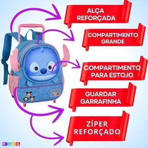 Contém; 01 Mochila Infantil Com Rodinhas Stitch Tsum.