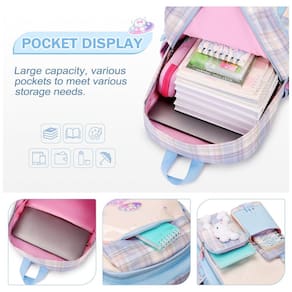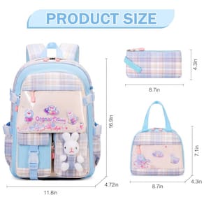 Mochila escolar infantil FIXITOK com tema de coelho kawaii em conjunto de 3 peças, composta por mochila, lancheira térmica e estojo, indicada para crianças e pré-adolescentes em idade escolar. O design em tom azul e roza xadrez combina lantejoulas peroladas, padrões cartoon e pelúcia de coelho aplicada na parte frontal, criando visual lúdico adequado ao uso em educação infantil, ensino fundamental e uso diário.