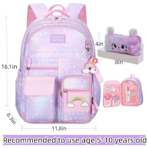 A combinação de cores em tons de roxo com elementos gráficos de arco-íris foi pensada para estimular a imaginação infantil e manter um aspecto alegre durante o uso. A mochila é recomendada para uso em escola, atividades ao ar livre, compras, viagens e outras situações cotidianas, mantendo foco em organização e conforto.