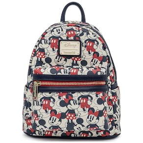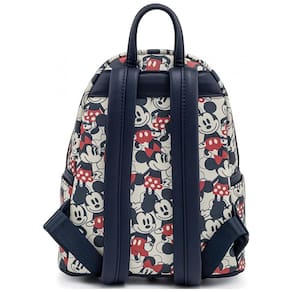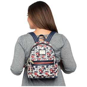 Loungefly Disney Mickey Minnie Mouse em toda a impressão oficialmente licenciado Concha de couro sintético e forro estampado esbranquiçado com vermelho e azul marinho Bolso frontal com zíper, bolsos laterais, alça superior, bolso interno com zíper e abertura com zíper duplo para o compartimento principal Alças de ombro ajustáveis Medidas aproximadas 22 x 25 x Marca: Não Informado