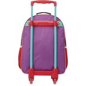 Produzida em poliéster resistente, frente em PVC + glitter aplicado e zíper com puxadores de metal personalizado. A mochila conta com um bolso principal amplo, dois bolsos laterais de redinha, alça de mão em poliéster com nylon reforçado, hastes com trava e rodinhas em gel decoradas com glitter.