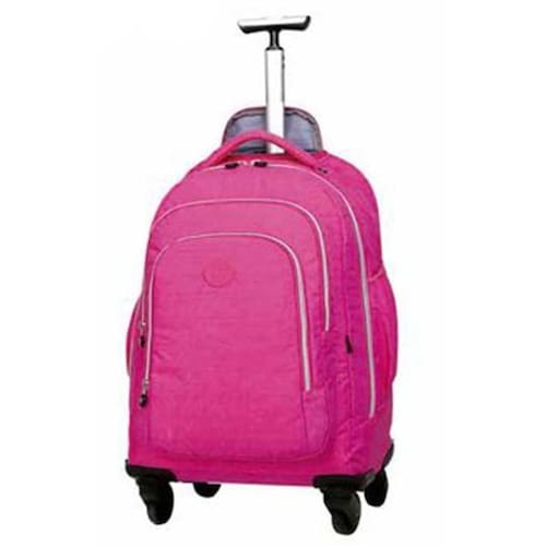 A mochila é feita em poliéster tactel, com design diferenciado, possui rodinhas 360