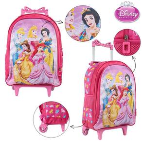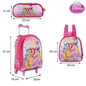 Kit Mochila Escolar Infantil Princesas Com Rodinhas, acompanha lancheira e estojo. Agora você pode levar sua mochila Das Princesas no seu dia a dia ou acompanhar você na escola. Possui alça de mão reforçada. Sua abertura maior se dá por zíper com puxador. Na parte de dentro possui amplo espaço para a guardar diversos materiais como cadernos, livros e estojos. Na parte da frente, possui bolso com zíper para a guardar pertences de menor tamanho, e bolsos laterais.Características: Especificações: - Alça superior - Estampa no bolso frontal - Puxador retrátil- Zíper metálico- Bolso Lateral Medidas Lancheira:- Altura: 22cm- Largura: 20cm Medidas Estojo:- Altura: 10cm- Comprimento: 23cm Medidas Mochila: - Altura: 41cm- Largura: 15cm- Comprimento: 32cm Dúvidas Frequentes:1. A mochila possui rodinhas em siliconeR. Sim, ela possui rodinhas em silicone transparente. 2. Ela possui alça retrátilR. Sim, ela possui alça retrátil para ocupar menos espaço. 3. Ela possui quantas divisõesR. Ela possui 02 divisões para guardar suas coisas. 4. Qual o material da mochilaR. Ela é feita em poliéster e plástico. TagsMochila, escola, escolar, meninos, infantil, rodinha, personagem, desenho, princesas, cinderela, aurora, bela e a fera, branca de neve. Marca: Toys 2U