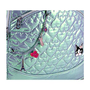 - Confeccionada com tecido personalizado na parte frontal com corações. - Com detalhes personalizados em metal. - Com chaveiro personalizado. - Com dois bolsos frontais com zipes personalizados. - Com bolsos laterais para Garrafinhas com elástico. - Com compartimento para notebook confeccionado com elástico. - Com alças acolchoada com regulagem para melhor conforto no transporte.
