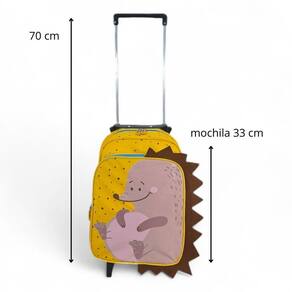 Medidas da mochila: 33 cm altura x 26 cm largura x 13 cm comprimento Capacidade 10 L, 13polegadas - comporta cadernos brochura grande Suporte com rodinhas de silicone e haste de alumínio Haste esticada com altura máxima de 70 cm.